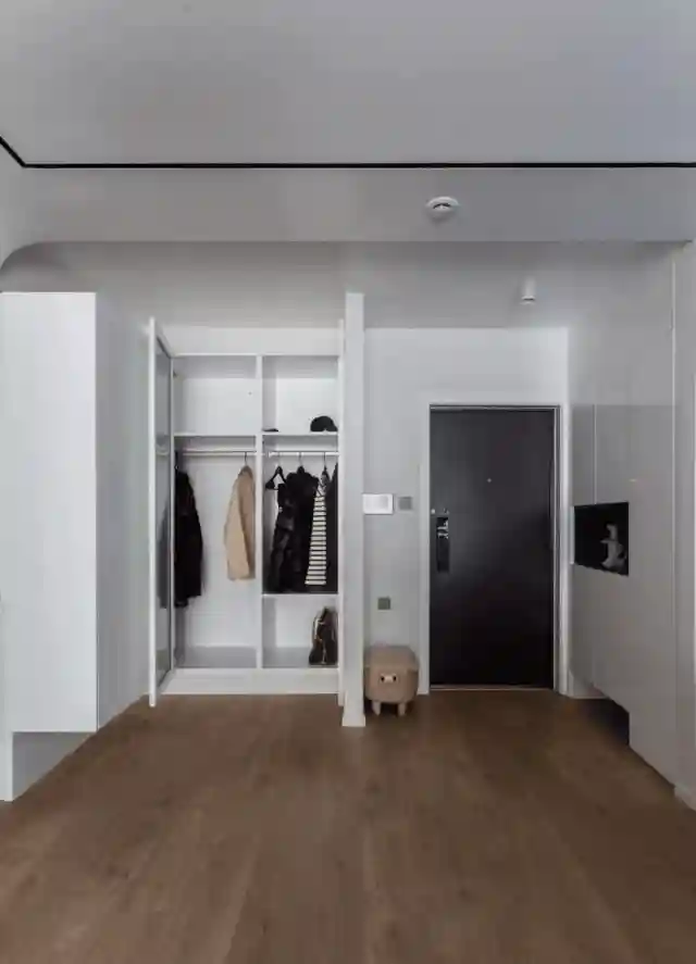 ▲进入卧室的过道收纳柜布局,采用移门镜柜门设计,同时满足收纳兼顾全身镜,同时视觉上可以放大逼仄的过道空间