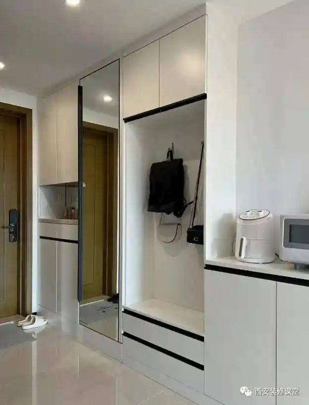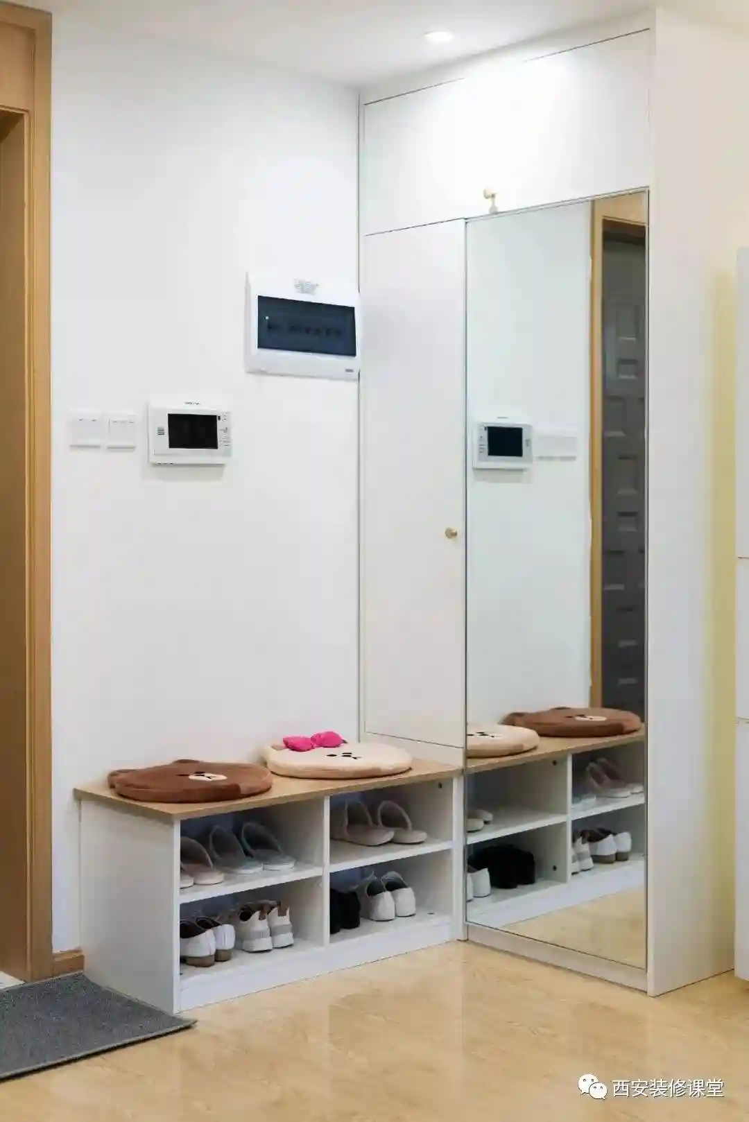 ▲如图进门鞋柜一扇通柜门镜面设计,兼顾了进门的全身镜功能