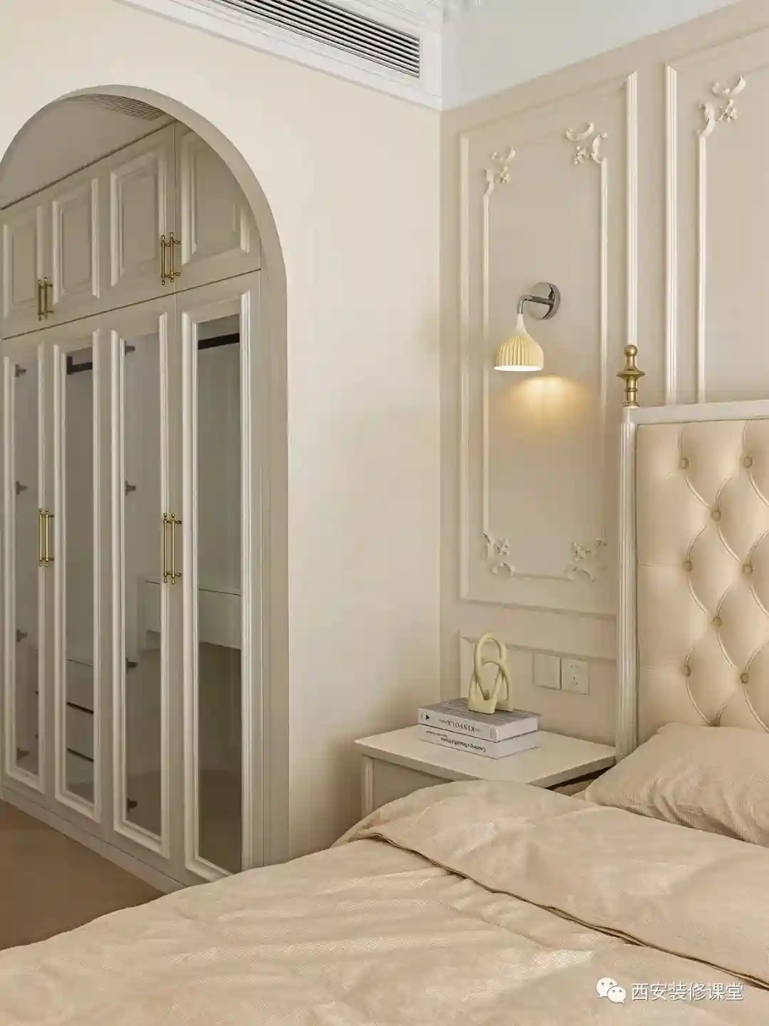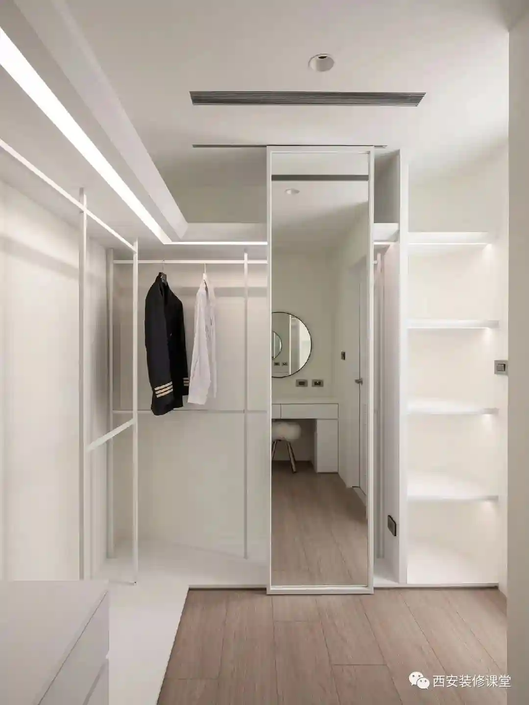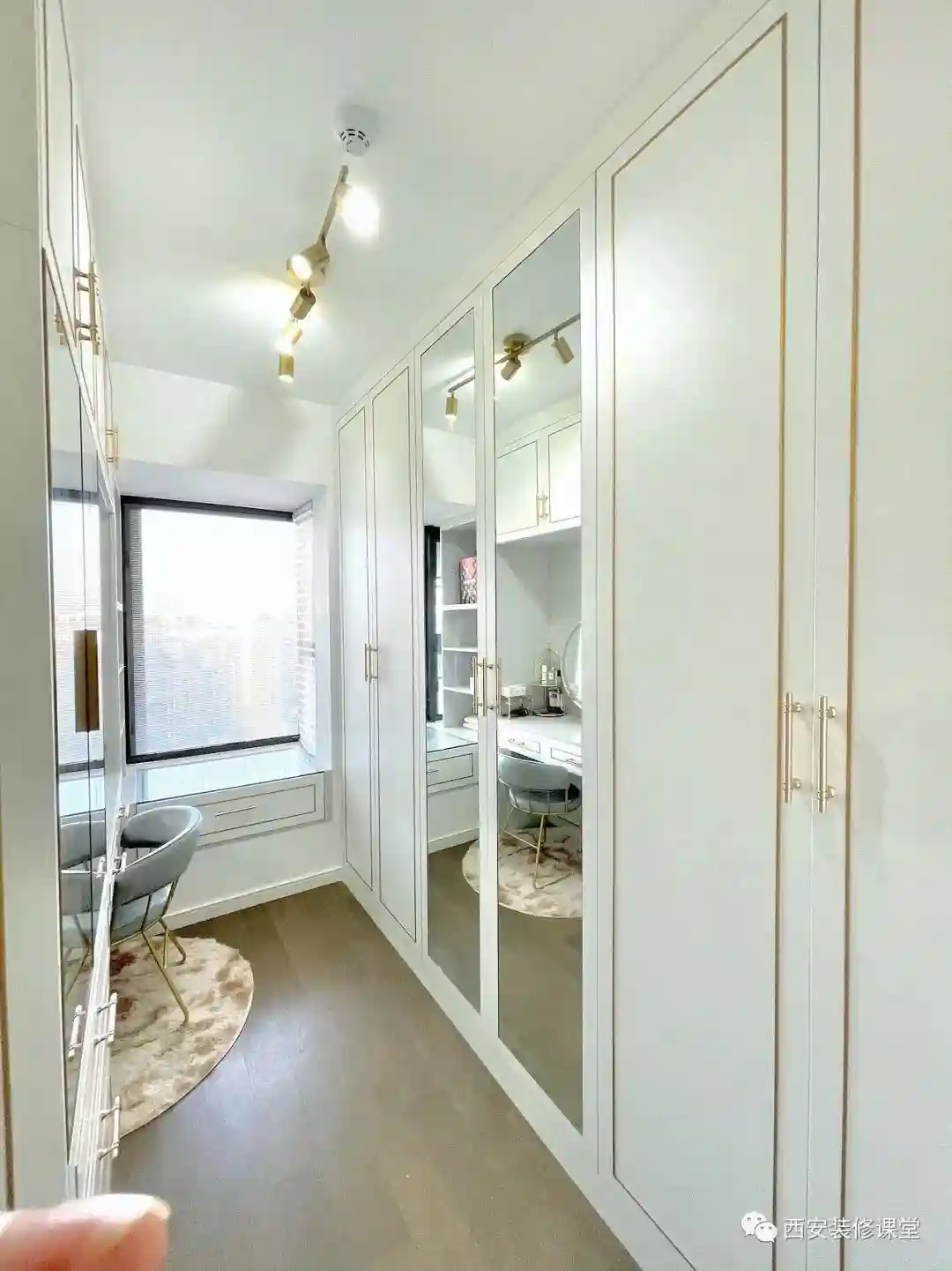 ▲法式衣柜定制,镜面柜门的加入,可以放大过道衣帽间的空间,同时兼顾了全身镜的功能