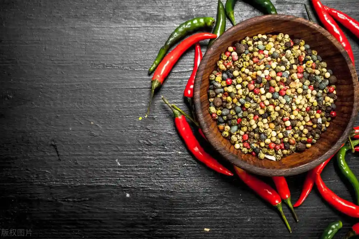 胡椒:原产于印度,有黑胡椒、白胡椒和绿胡椒。黑胡椒味道浓郁辛辣,白胡椒相对温和,绿胡椒有果香。是西餐基础调味料,用于多种烹饪方式的菜肴。