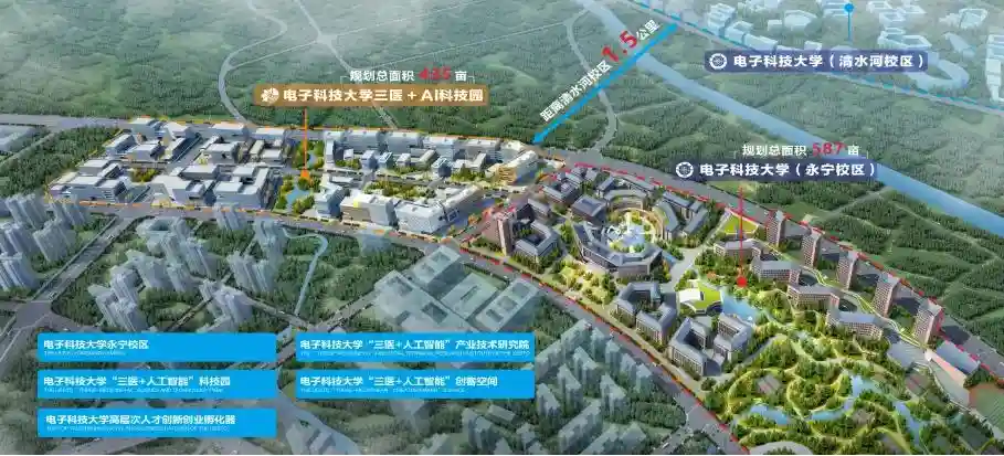 永宁校区距离清水河校区约1.5km,将致力于信息医学、生命与人工智能等交叉领域的人才培养和科学研究。