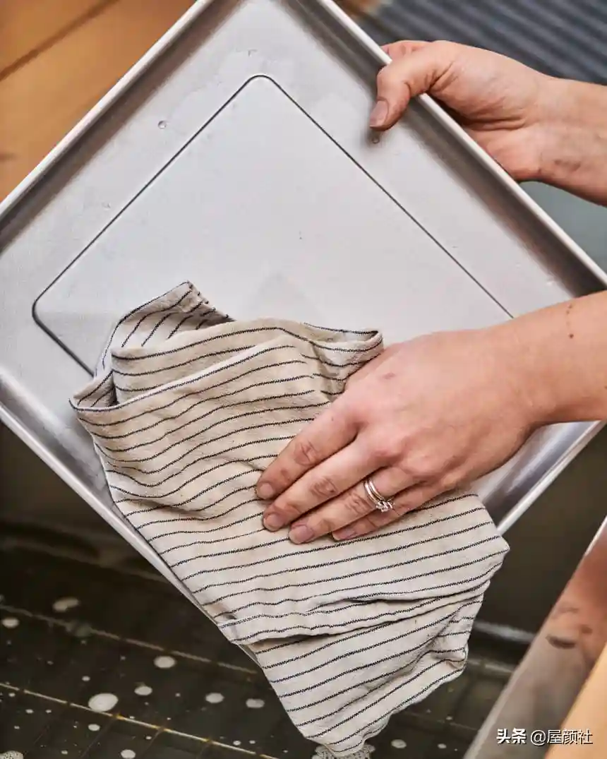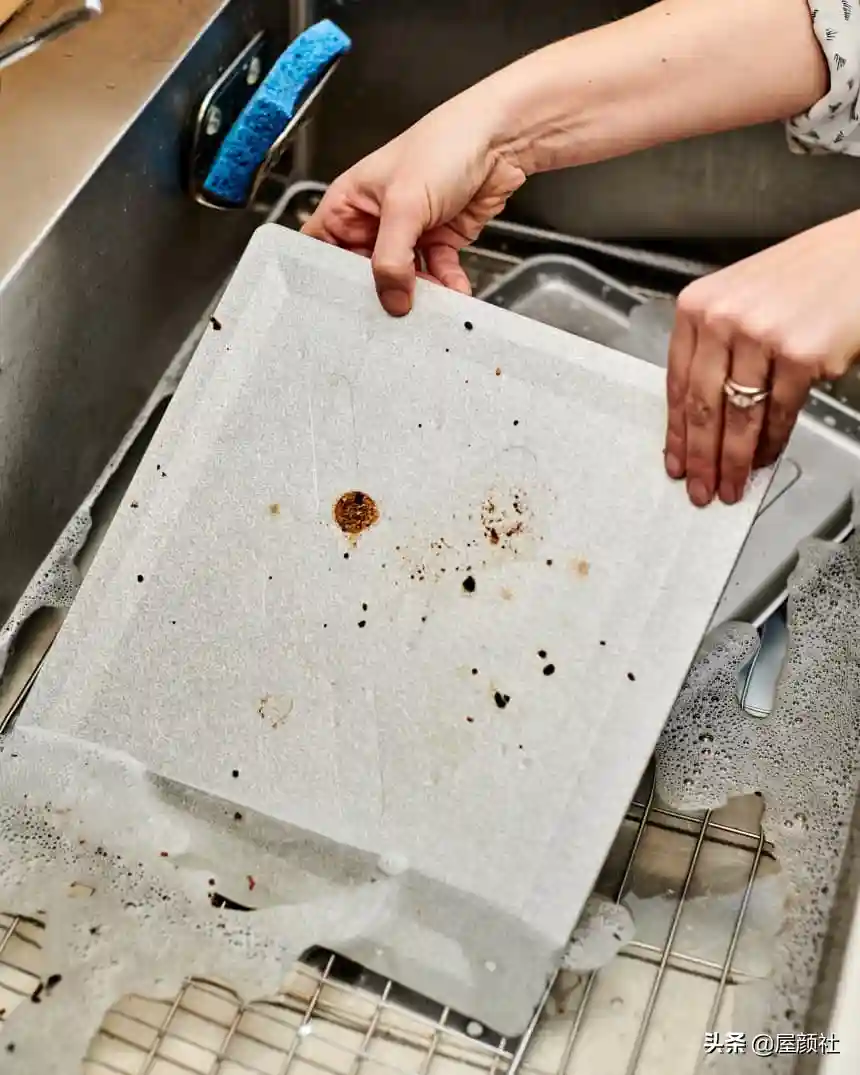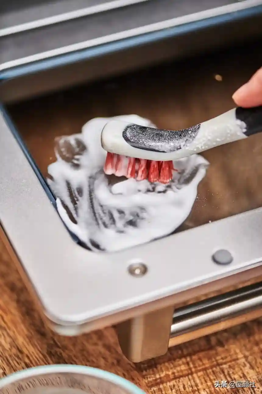 完成以上步骤,之前浸泡的烤盘架子差不多可以取出来,现在可以用牙刷轻松清除所有粘附的污垢或油腻。如果你感觉它还是不好擦,那可能浸泡时间不够,只能再等候一段时间。