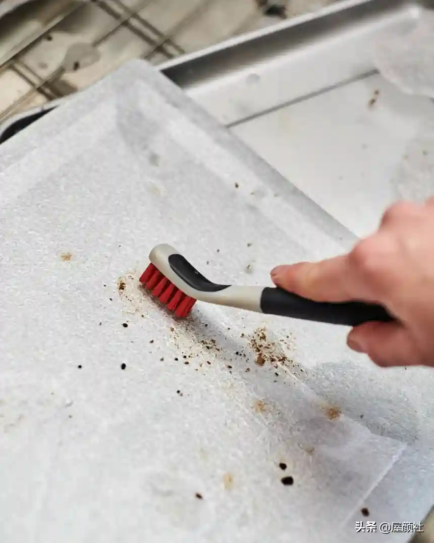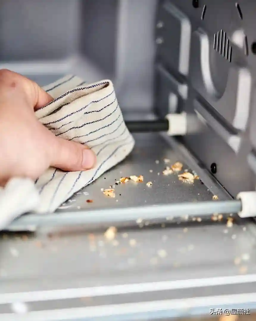 用干抹布将所有碎屑、面包屑从烤箱中擦出。然后使用牙膏刷清除卡在角落以及比较顽固的所有杂质。