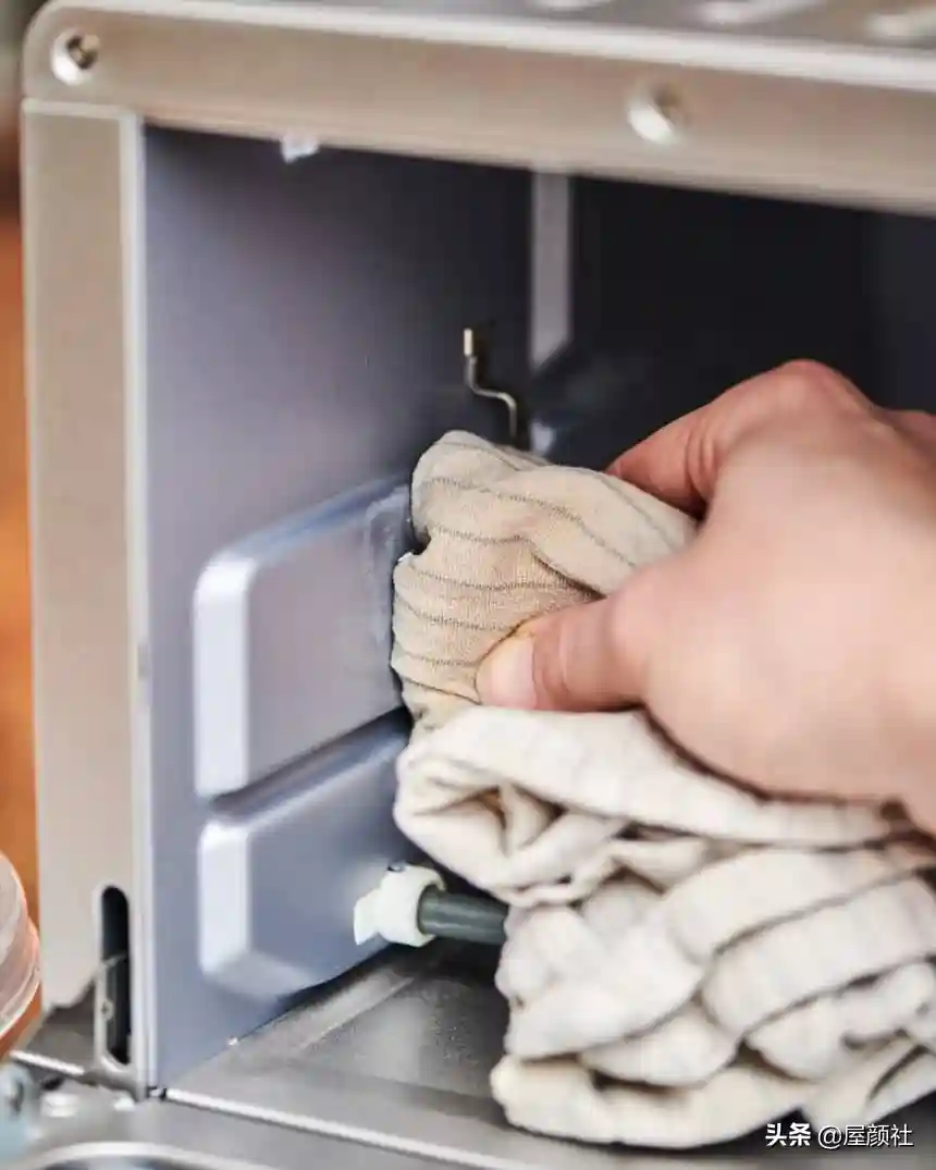 很明显的杂物清洁完毕后,用湿润的抹布再次擦拭内部。不需要沾染清洁剂或者肥皂,只用湿润的抹布,擦拭2-3次即可。