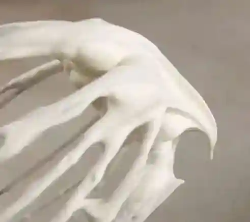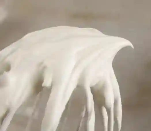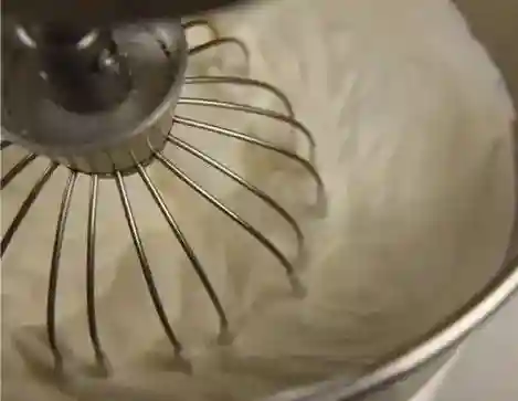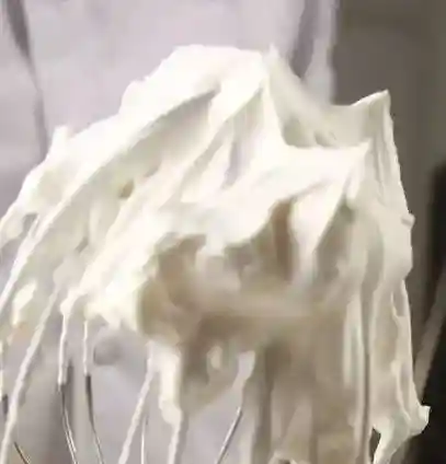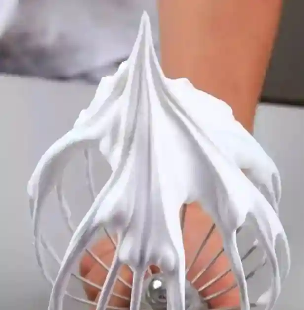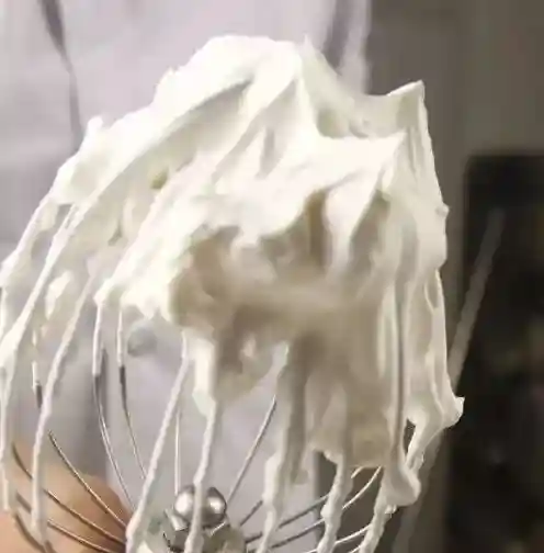 湿性发泡:打发过软,奶油的鸡尾弯曲大,如果将之倒放奶油有些流动。