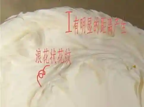 当奶油打到有明显的浪花状花纹时,且奶油与桶边的距离越来越大时,就表示奶油已打发到位了。