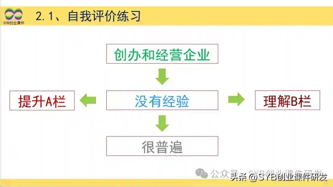我们大多数人对于创办和经营企业是没有经验的,这是很普遍的事实,我们要做的就是提升A栏,理解B栏。