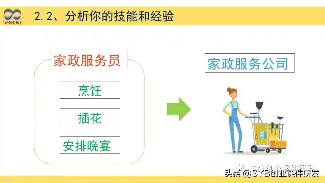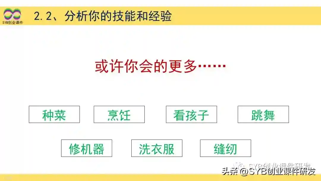 或许你会的更多,例如种菜、烹饪、看孩子、跳舞、修机器、洗衣服、缝纫等技能,可以以此延伸出更多的企业想法。