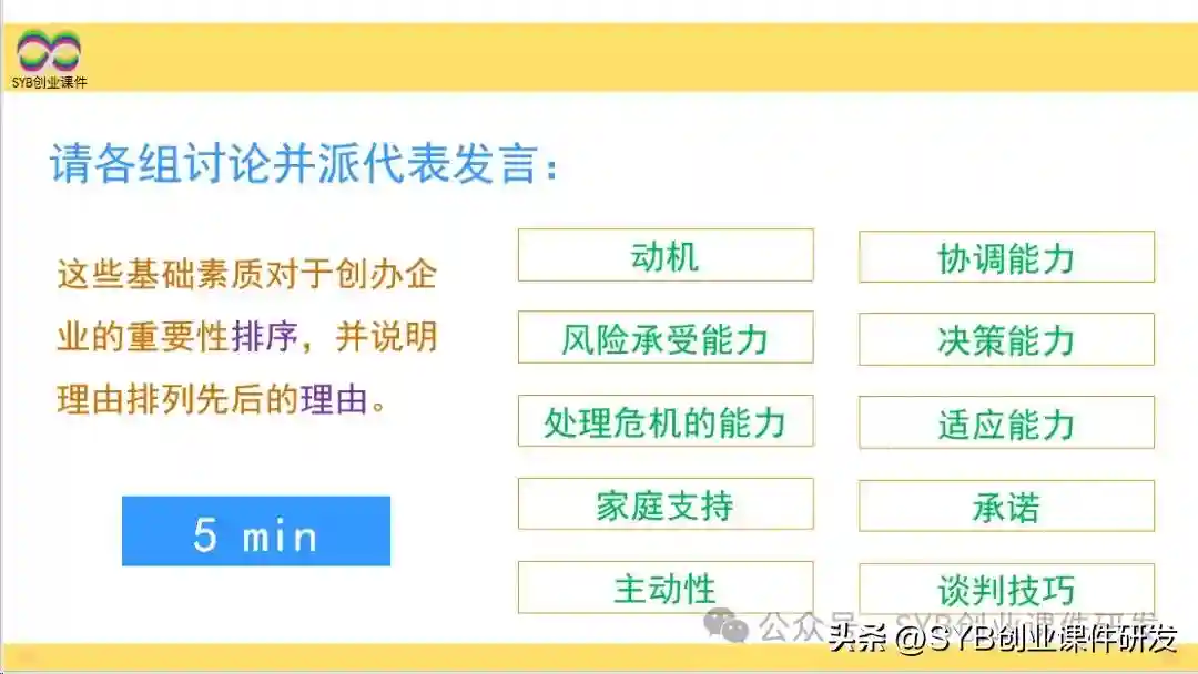 接下来,请各组讨论并派代表发言:这些基础素质对于创办企业的重要性排序,并说明理由排列先后的理由。