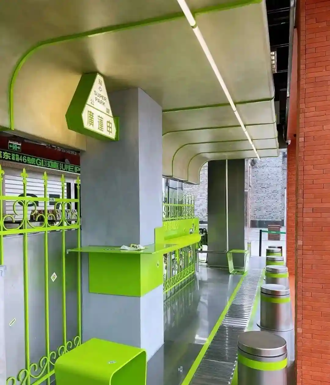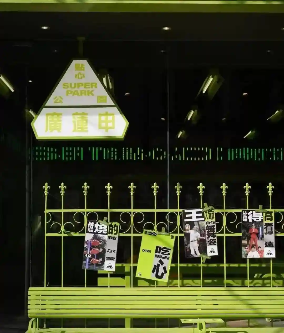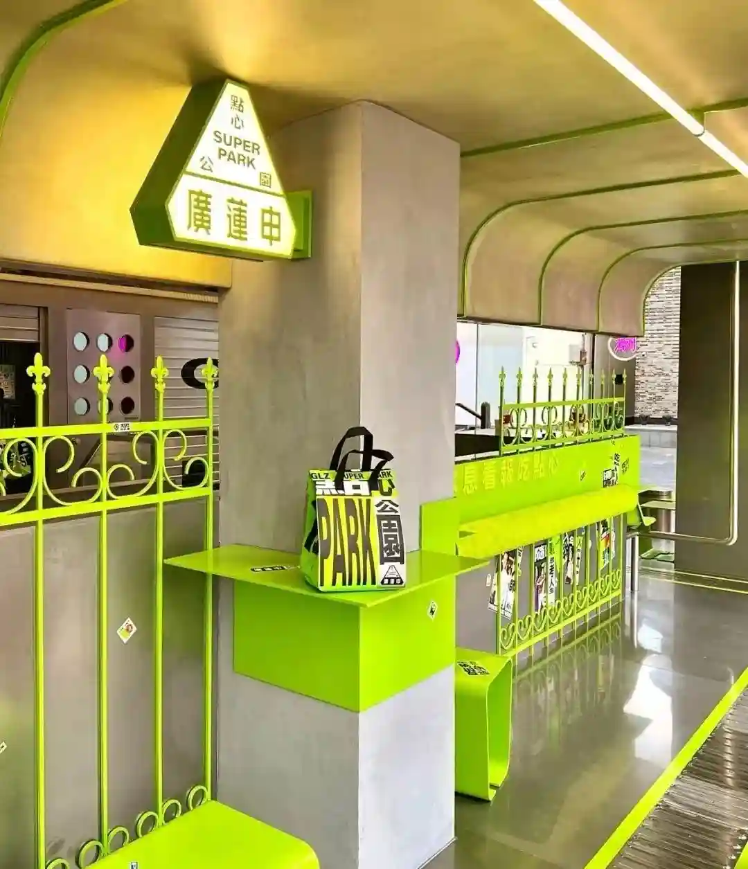 贴合“公园”主题,空间主题色提取了最能代表公园的草绿色,再将其亮度调高,形成扎眼的荧光绿。透过外立面的透明玻璃,可以清晰地看到绿色的铁栅栏,这是公园的标志性元素,从外立面就给人一种公园即视感。