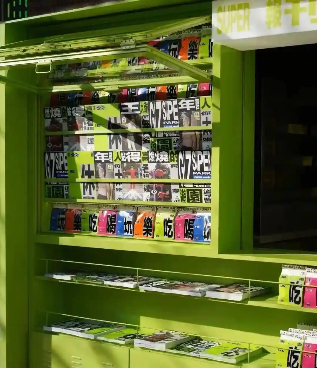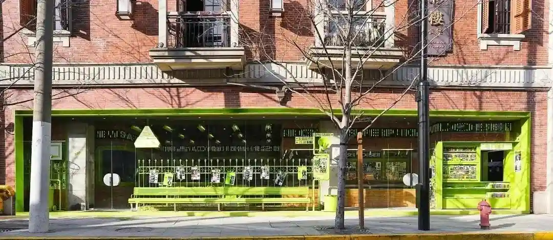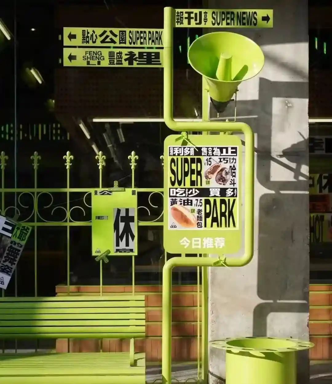 贴合“公园”主题,空间主题色提取了最能代表公园的草绿色,再将其亮度调高,形成扎眼的荧光绿。透过外立面的透明玻璃,可以清晰地看到绿色的铁栅栏,这是公园的标志性元素,从外立面就给人一种公园即视感。