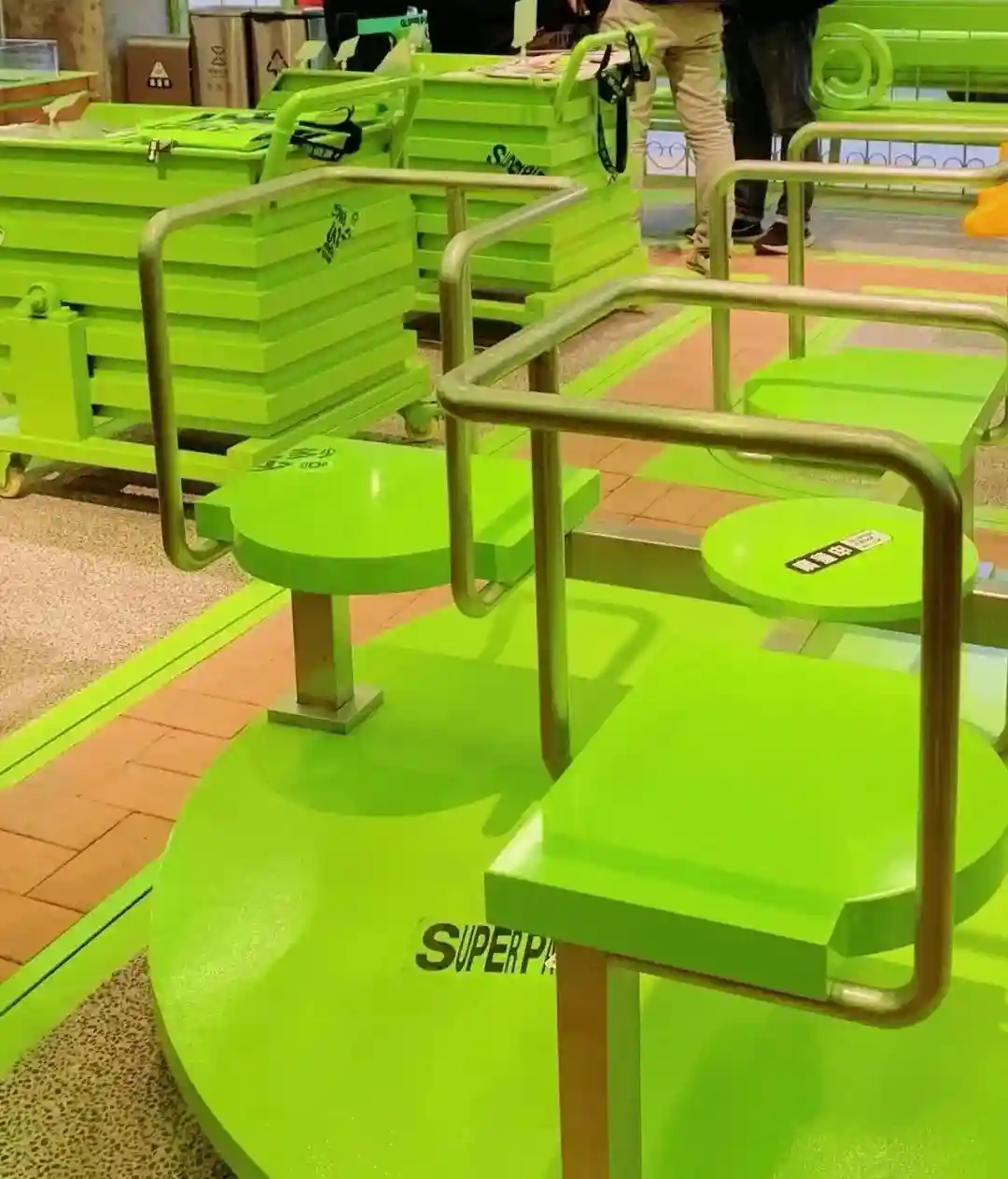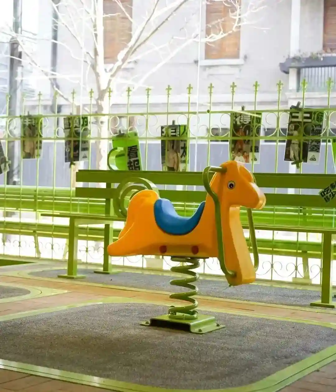 公园里供小朋友玩的弹簧摇摇椅以及转转椅,都被搬到了空间当中,提升了空间的童趣氛围感。而空间内的座椅,也采用了公园常见的木板长椅。这些元素的加入,共同构建了一个真实的公园场景。