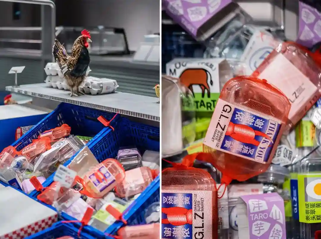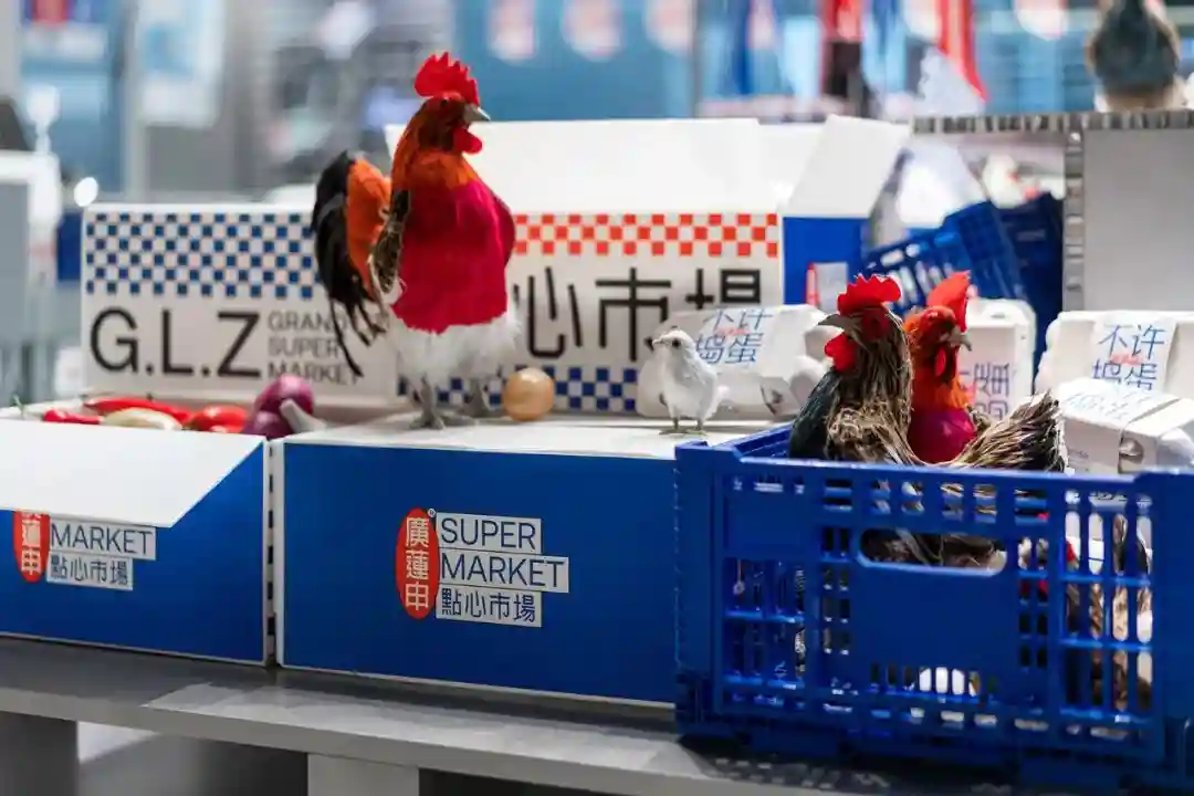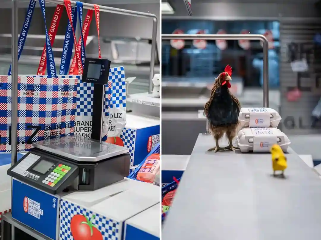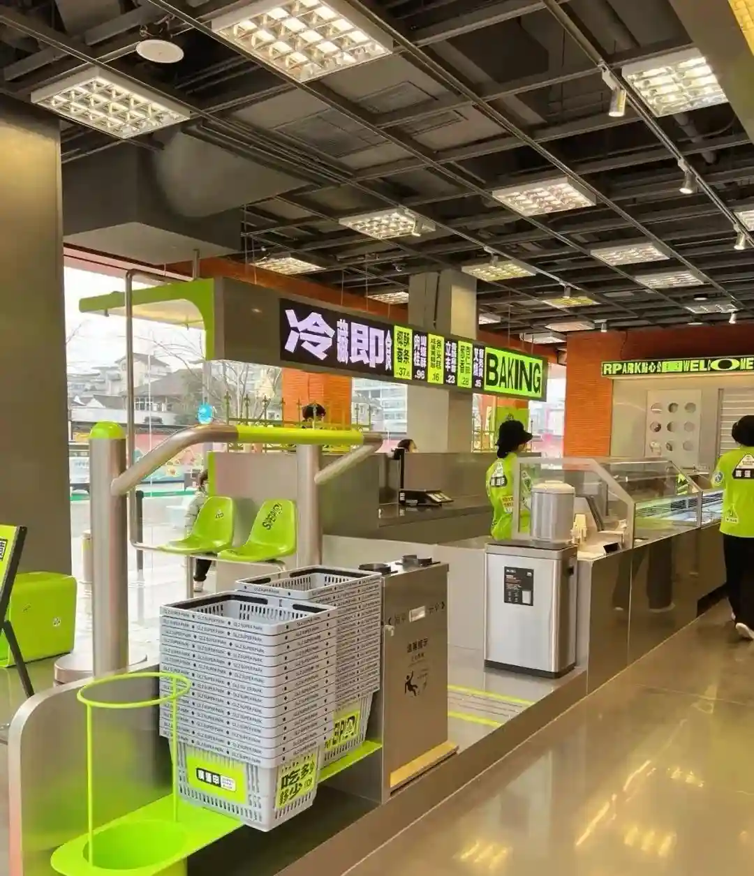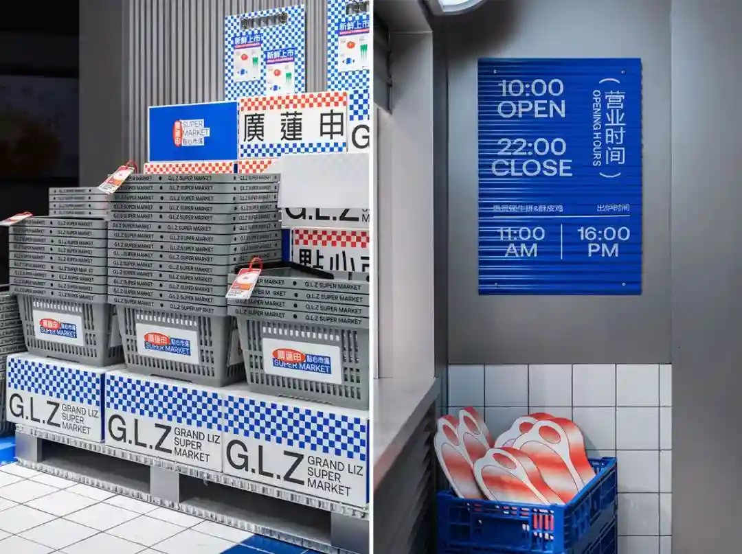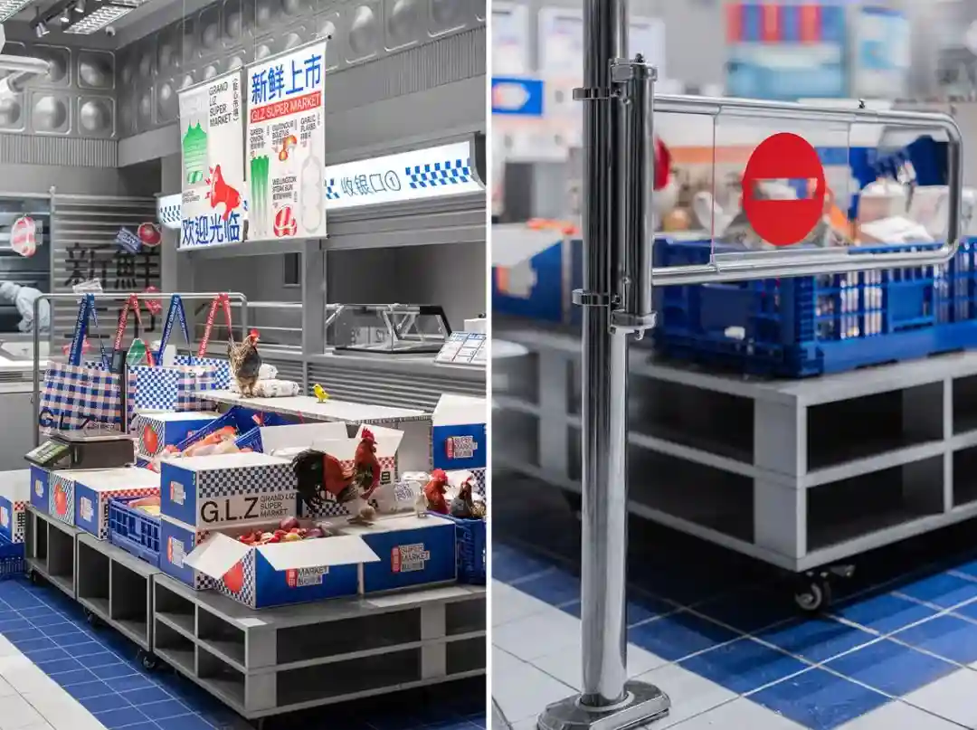 入门处放置的菜篮子以及蔬菜、家禽摆件,就感受到了浓厚的市场氛围。从左侧入口进入室内挑选商品,再从右侧的出口结账离开,环形的空间动线起到了引导消费者购物的的作用。保证消费者不错过每一部分的惊喜的同时动线混乱带来的人员拥堵现象。