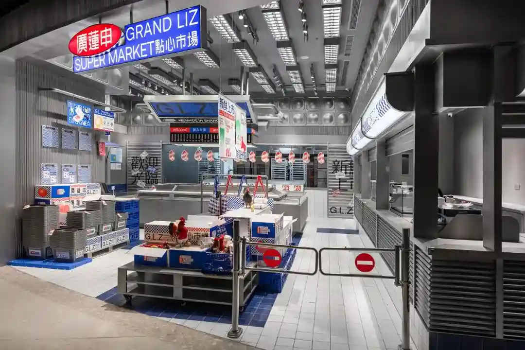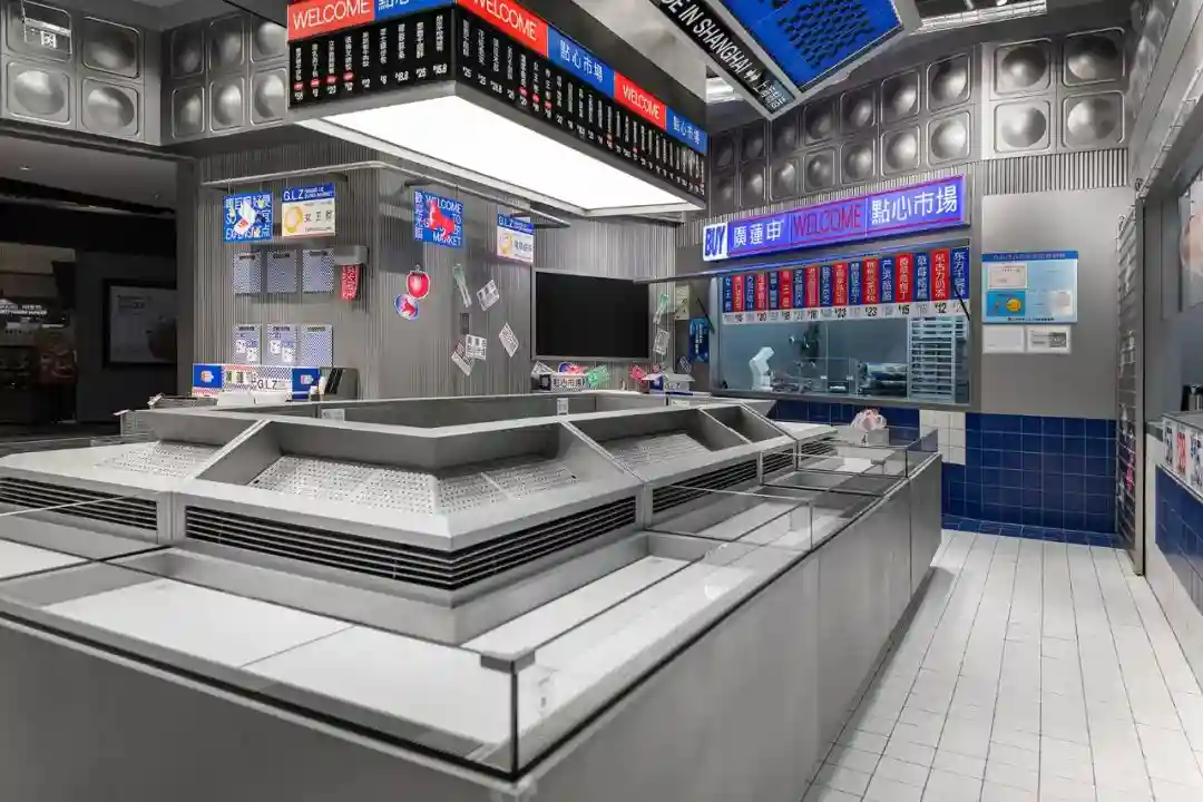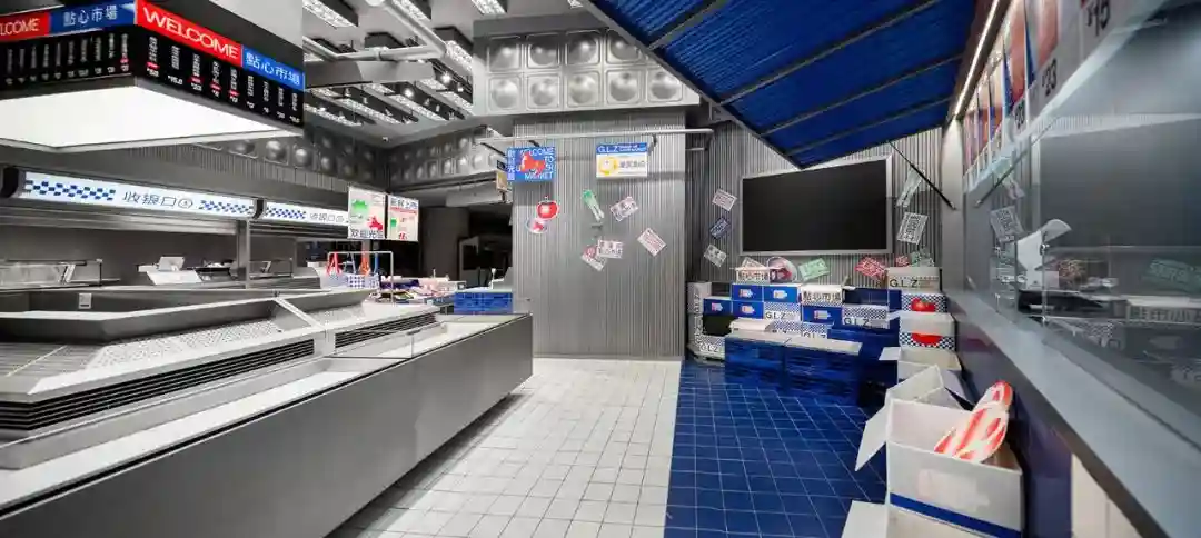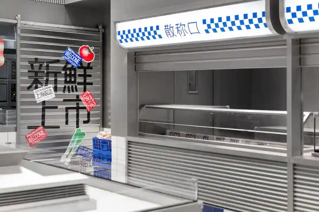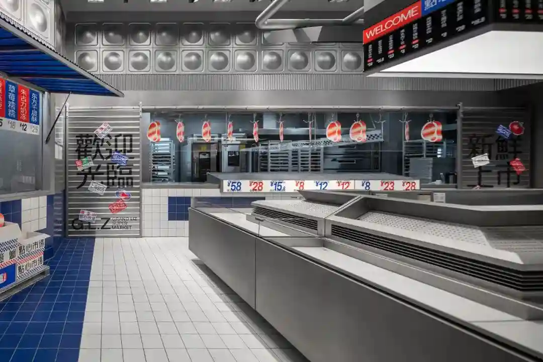 而为了打造沉浸式的市场空间体验,模仿市场的蔬菜区、海鲜区以及肉类售卖区的空间风格,设置了不同的产品售卖区域。而为了增加市场空间的潮流感,大部分区域都由金属元素进行搭建。