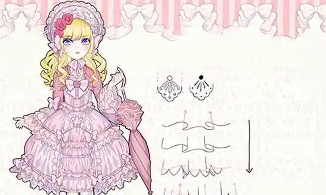 如果想要表现得更细致一些,我们可以通过增添简单柄图或丰富服装款式的方法,来达到提升华丽感的效果。大家可以选择在裙身处绘制多层蕾丝和蝴蝶结,以此来让洛丽塔呈现出“呲甜”的感觉。同时,我们还可以在网络上参考姬袖的外观设计,将袖子绘制成姬袖的模样,在此基础之上再添加相应的服装配饰,就能很直观地感受到甜系洛丽塔风格应有的感觉。