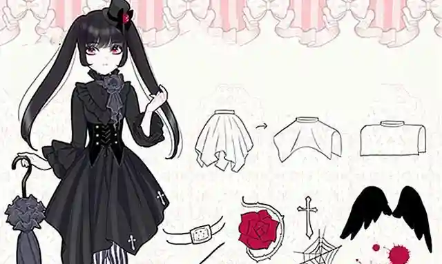 在不擅长画柄图的情况下,我们可以通过细化裙摆花边来达到最理想的华美效果,想要展现出洛丽塔风格的精致感,其实不一定要通过柄图来表达。同理,喜欢哥特风洛丽塔的姐妹,也可以通过色彩搭配和款式结构来表现裙子的暗黑感与独特感。不规则的裙摆设计以及在暗黑风格中尤为常见的十字架、黑色翅膀、玫瑰花和眼罩等等设计元素,都可以适当运用起来,这样服装的个性就会得到很好的表达。