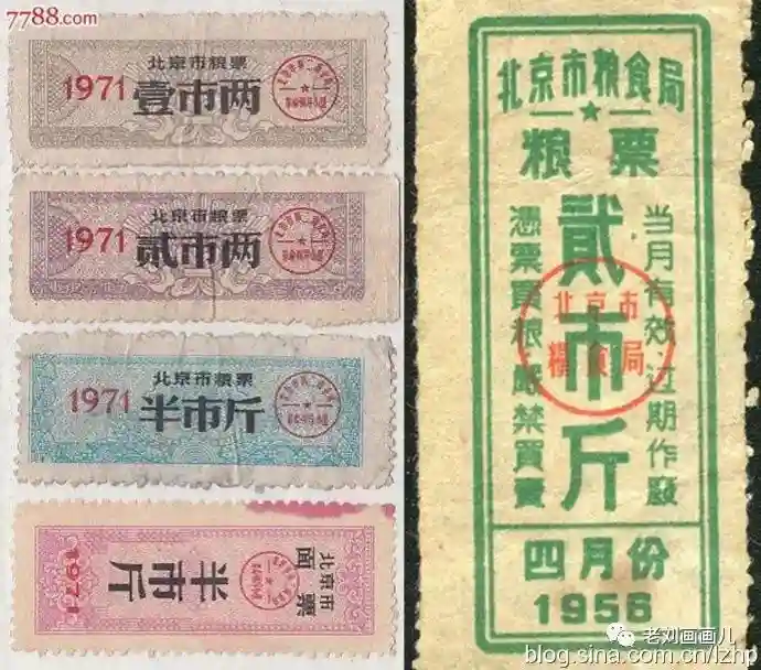 粮店的工作人员每月会入户为居民发粮票,粮票分为米票和面票,限当年使用过期作废,只有面额半斤的米、面票,可以跨年使用,还有全国粮票专供出差人员使用。记得每年的10月份是粮店供应白薯的季节,每户根据人口每人限5斤,在粮本上记录一下,每斤才几分钱,有住大杂院的居民找来三轮车或手推车,一下把全院的白薯都买走回去再分。