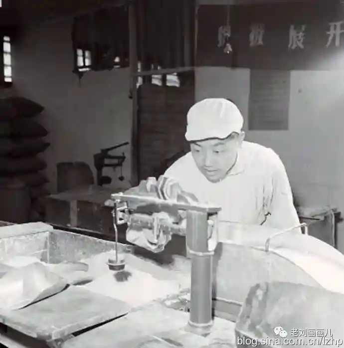 1963年6月,广安门外大红庙粮店青年售货员王继洛正在称面粉。王一波摄